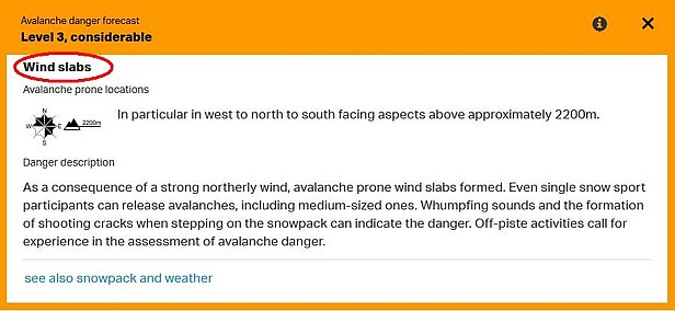 Although wind is seldom absent when snow falls, so that wind slabs are usually formed as well, the main danger arises from the additional load applied by the new snow. Another typical characteristic of the avalanche problem “new snow” is the existence of avalanche prone locations over a wide area. In the case of the avalanche problem “wind slabs”, in contrast, the avalanche prone locations are more localised and most often easier to recognise. In future, the avalanche problem “wind slabs” is to be named only when the primary cause of danger is the transportation of snow by the wind.