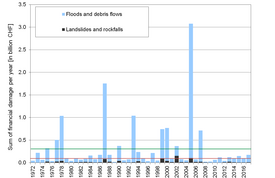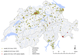 The Swiss Federal Institute for Forest, Snow and Landscape Research (WSL) has been systematically collecting information on storm damage since 1972. The database created with significant support from the Federal Office for the Environment (FOEN) contains data on damage caused by floods, debris flows and landslides and, since 2002, rockfall, rock slides and rock avalanches. Damage caused by avalanches, snow pressure, earthquakes, lightning strikes, hail and gales is not taken into account. Estimates of property, infrastructure, forest and agricultural damage are based primarily on media reports. The data are available to experts upon request and constitute an important basis for risk assessment.