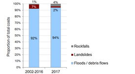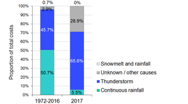 Natural hazard events occurring in 2017 claimed eight lives and caused damage to property totalling around CHF 170 million. This is the highest amount since 2007 (CHF 700 million), but still significantly less than the inflation-adjusted average of CHF 307 million for the years 1972-2016. Roughly 94% of the estimated damage was caused by flooding or debris flows, while landslides accounted for 2% and rockfall for nearly 4%. Most damage (about 66%) was caused by thunderstorms and other heavy precipitation, and more than 5% was caused by persistent rain. In 29% of cases, damage was caused by other or unknown factors.