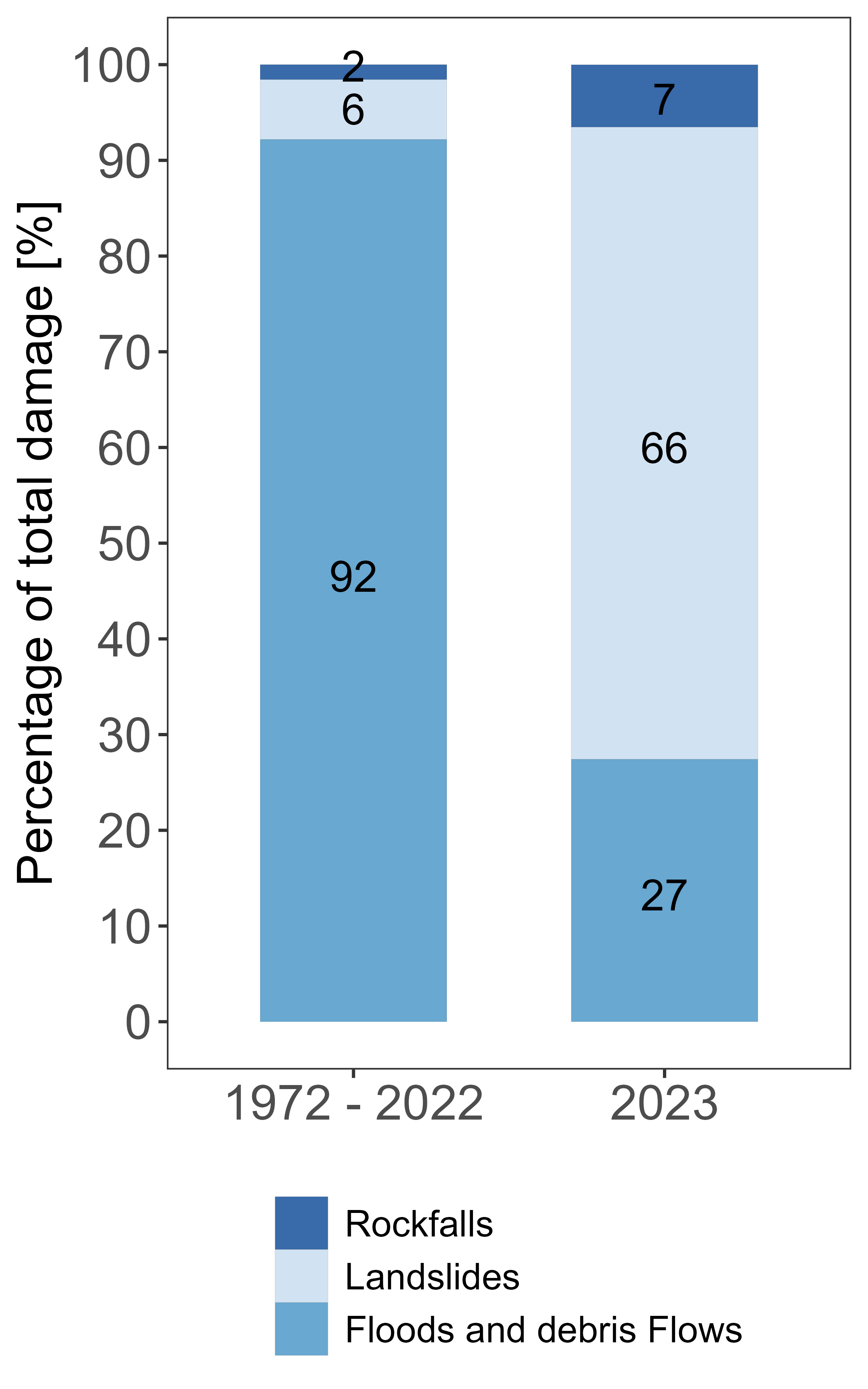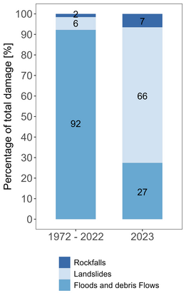 Locally, there was major damage in 2023. Looking at Switzerland as a whole, 2023 was a rather low-damage year compared to the long-term average and median. Thanks to good preventive measures, there were fortunately no fatalities caused by floods, debris flows, landslides, and rockfall events. In the 52-year observation series, 2023 ranks 37th, with a damage amount of 75 million Swiss francs. The largest share of the estimated damage costs (around 66 %) was caused by landslides, followed by floods (21 %), rockfall and rock avalanches (7 %) and debris flows (6 %). The main causes were continuous rain (67 %) and rain in combination with snowmelt (18 %).
