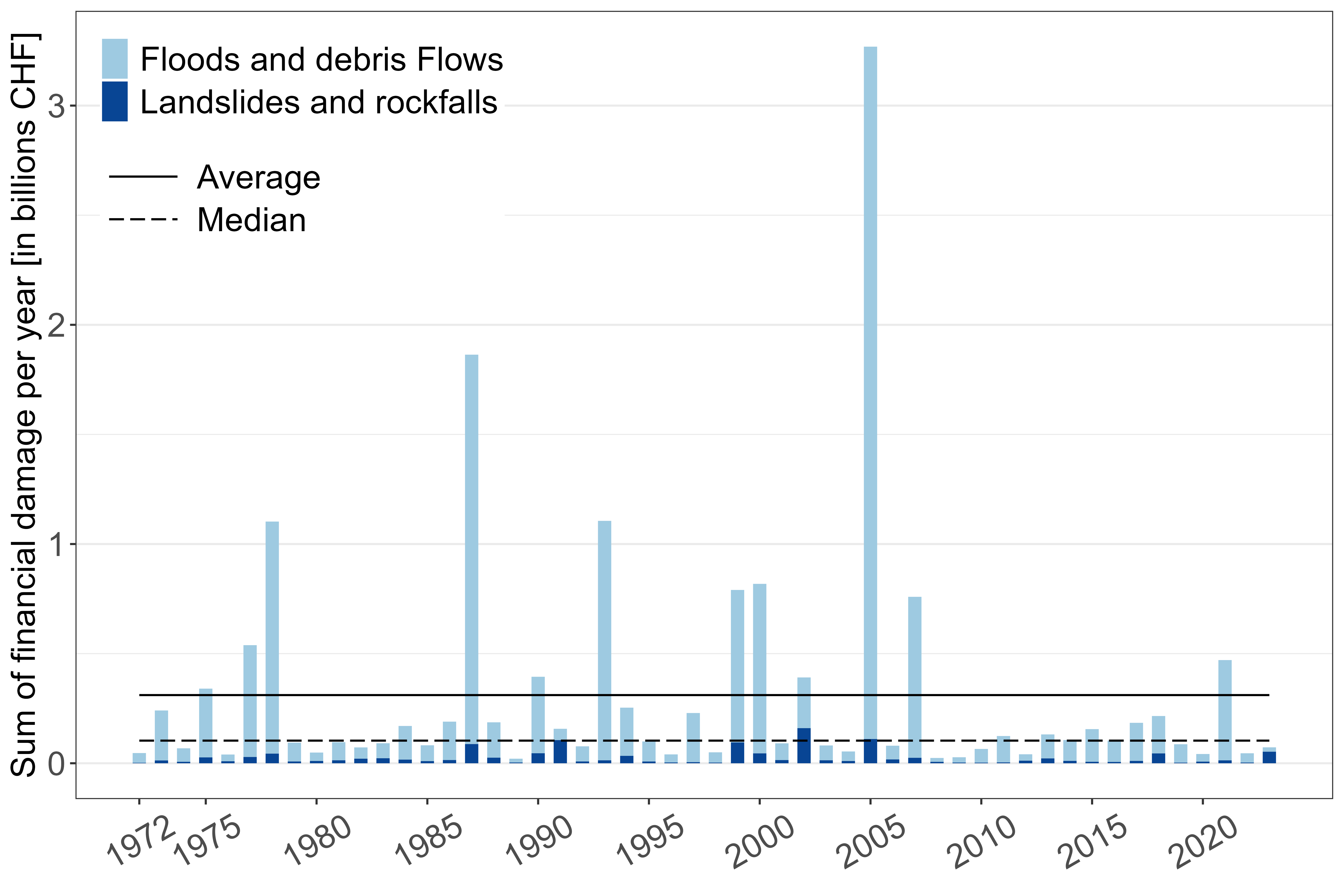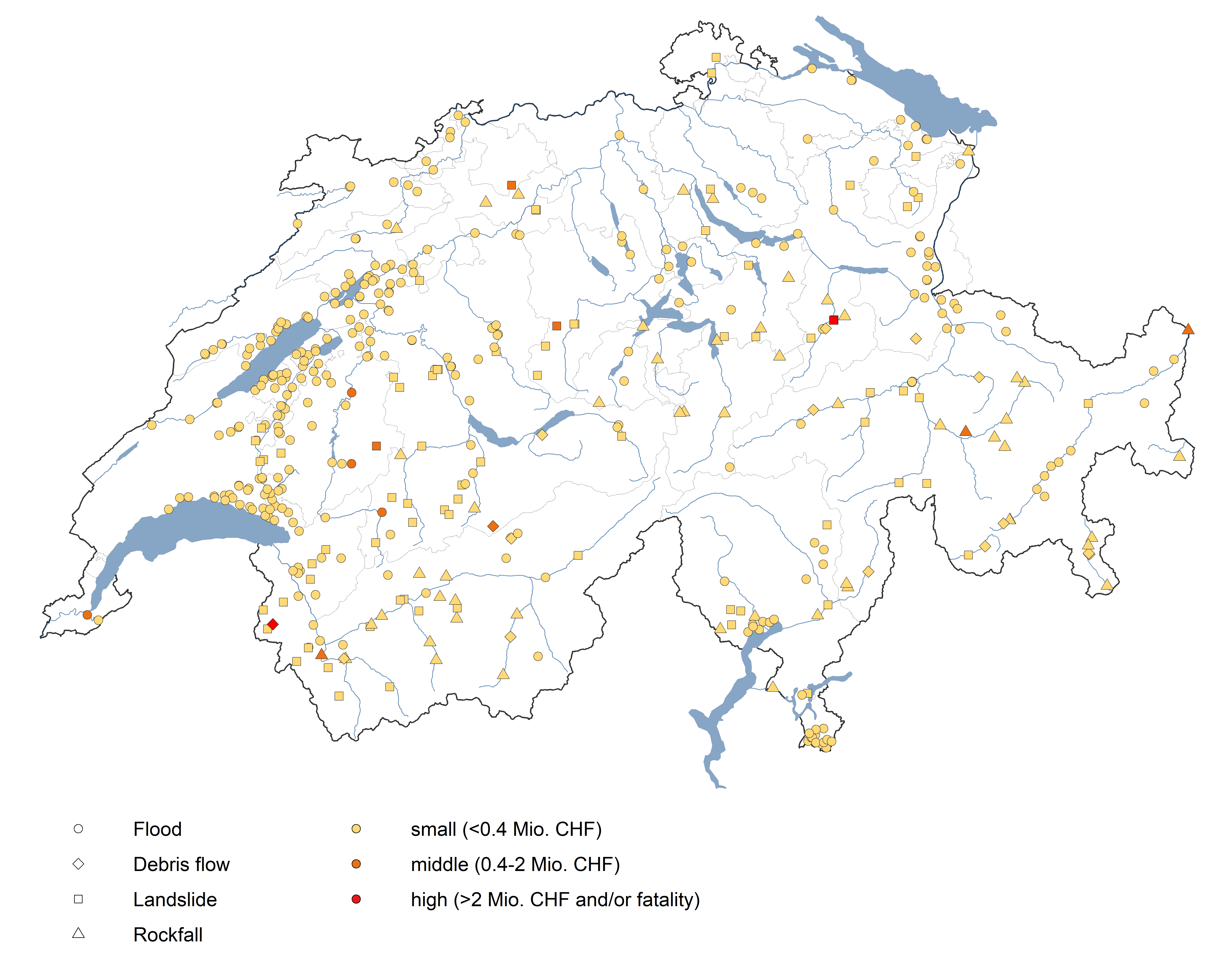 The Swiss Federal Research Institute WSL has been systematically collecting information on storm damage since 1972. The database, compiled with the support of the Federal Office for the Environment FOEN, contains information on damage caused by floods, debris flows, and landslides as well as rockfall, rock avalanches, and rockslides. Damage caused by avalanches, snow pressure, earthquakes, lightning, hail, and storm winds is not included in the analyses. Estimates of damage to property, infrastructure, forests, and agriculture are mainly based on media reports. The data is available to experts on request and forms an important basis for risk assessment. The WSLs storm damage survey is used for environmental reporting by the Federal Office for the Environment FOEN.