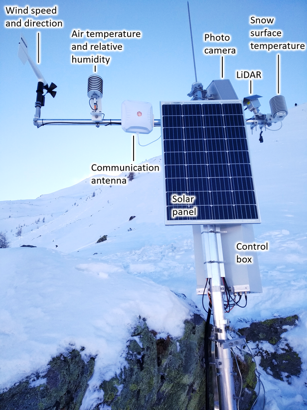 Important input parameters for the avalanche simulation are the snow conditions and the snow depth distribution in the avalanche release area and the avalanche track. To get the best results, the input data should depict the conditions as truthfully as possible. But the snow depth is not evenly distributed across the slope and is constantly changing with the influence of wind. The group has already a lot of experience with drones to capture the snow depth distribution in alpine terrain (see: Capturing snow depths by using drones).The acquisition with drones gives information at a high spatial resolution, but in our application we also aim for a high temporal resolution. Therefore, we developed and installed a fixed, ground-based remote sensing monitoring system that is operating autonomously throughout the whole winter season to map the snow depth distribution once per hour. In a next step we will use the newly build up snow depth database, meteorological (snowfall, wind, temperature) and terrain information to develop a simulation approach, that allows us to calculate the conditions for any slope, without a costly monitoring system.