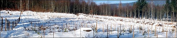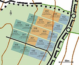 The trial was established as experimental block design with 7 treatments (=tree species) und 3 replicates. The trial near Mutrux covers an area of 3 ha, and each of the 21 experimental units is 0.12 ha in size. The spacing is 2 m x 2 m. This design enables the observation of a sufficient number of trees of each species till the small timber stage is reached.