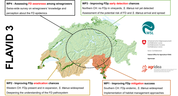 The overall aim of FLAVID 3 is to better understand the different FDp epidemiology situations in vineyards and seminatural compartments across Switzerland. Our findings will help to refine the monitoring and management of Swiss vineyards and reduce costs related to this quarantine disease for practitioners, as well as national and cantonal authorities.