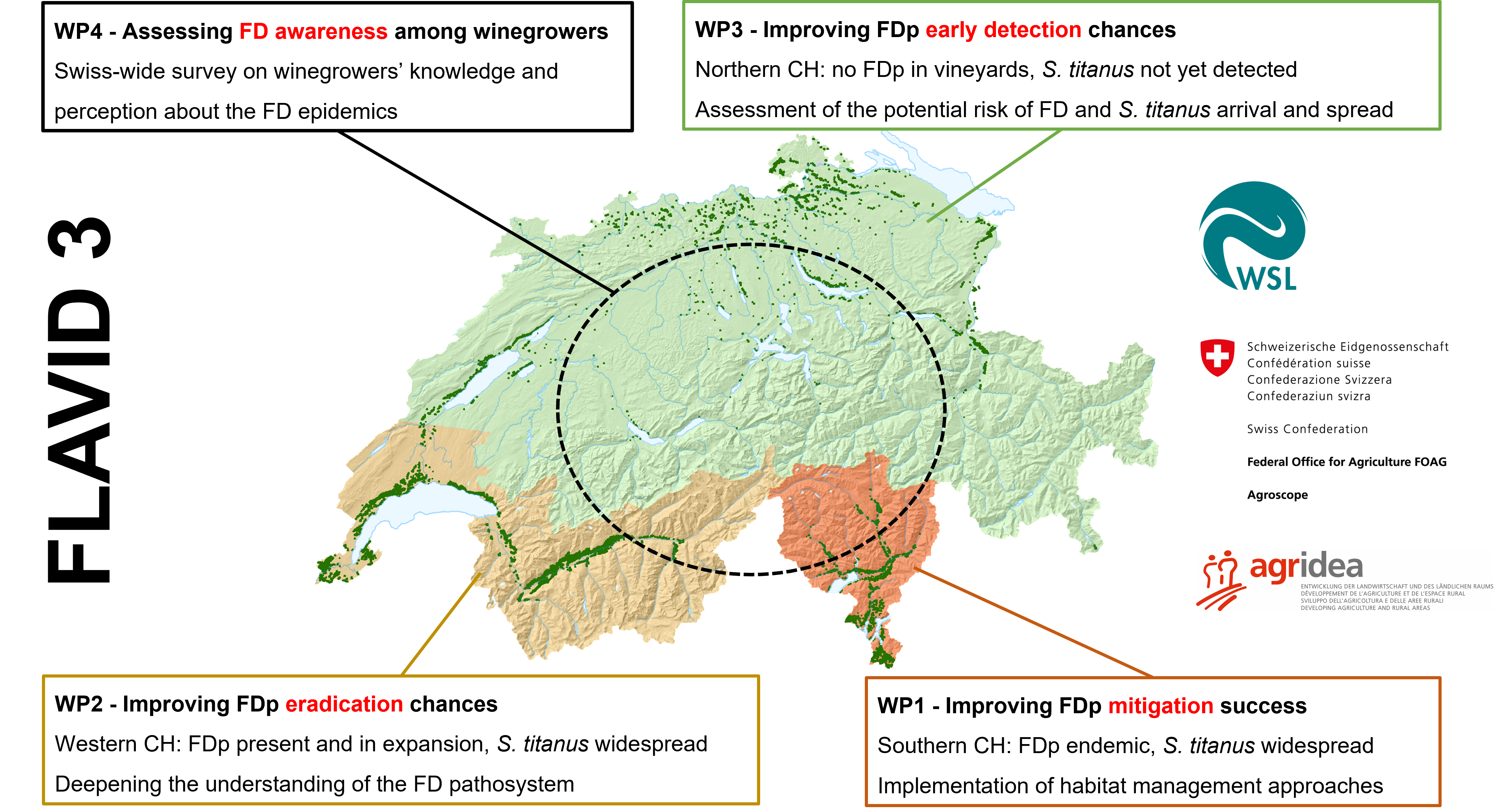 - WP2: Deepen the understanding of the FD pathosystem in areas where FD and S. titanus are currently spreading (i.e., FDp present and in expansion, S. titanus widespread; study area: Western CH);