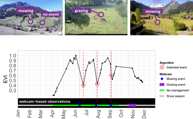 To assess the quality of the resulting maps, we verified the management events detected by the algorithm with daily information on grassland management from images of 82 publicly accessible webcams from all over Switzerland. Finally, we evaluated the potential of the generated maps for ecological applications using data on agricultural land use and the Swiss Biodiversity Monitoring (BDM).