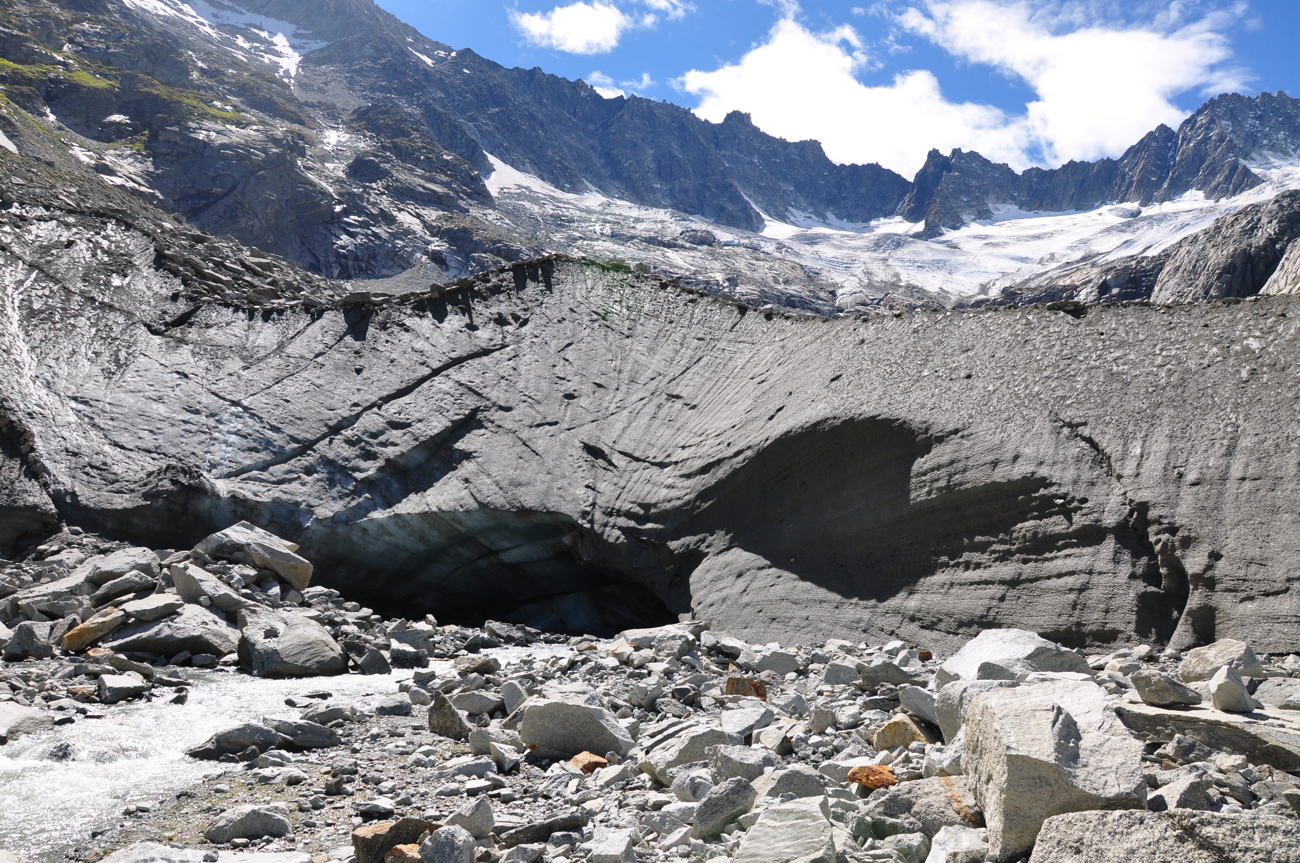 Damma glacier: Rock material from the glacier forefield and the glacier toe of the Damma glacier at around 2100 m above sea level in central Switzerland. The glacier forefield is free of plants and consists of stony ground. The glacier toe is covered with fine rock material.