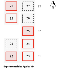 The experimental set-up consists of a fully randomised block design replicated three times at each site. Each block includes three plots with the following treatments