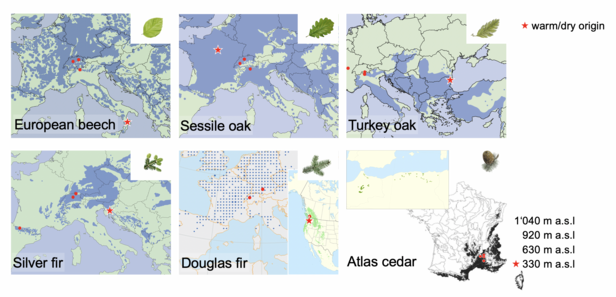 In the Polytunnel Greenhouse Experiment, seedlings of native beech (Fagus sylvatica), sessile oak (Quercus petraea), and silver fir (Abies alba) are grown alongside Douglas fir (Pseudotsuga menziesii), Atlas cedar (Cedrus atlantica), and Turkey oak (Quercus cerris), three species that are non-native to the Swiss Plateau. For each species, seeds of four different origins were used to grow seedlings in a nursery in Switzerland. The 2-yrs-old seedlings were transplanted to the experimental sites in autumn 2021.