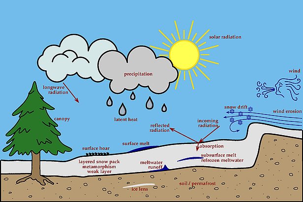 Alpine3D is a spatial, three-dimensional snow cover and earth surface model developed by the SLF. It simulates the most important physical processes (mass and energy exchange) that take place between the atmosphere, snow and soil on mountain topography. It consists of a number of modules that can be activated as required: