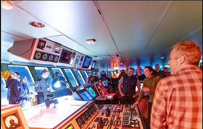 Pour le Nouvel An, l’événement spécial fut l’apéritif officiel sur la passerelle du navire, baigné pour l’occasion dans une lumière rougeâtre, et non dans son crépuscule habituel. Cette timonerie, d’où l’on dirige le navire, est habituellement un endroit solennel et silencieux, et ce changement d’ambiance festif était surprenant. Nous avons porté un toast à la nouvelle année, en contemplant les étendues glacées, tandis que des fusées éclairantes ont joué le rôle de feu d’artifice depuis l’hélisurface. Chacun a pu échanger des souhaits de chance pour la nouvelle année.