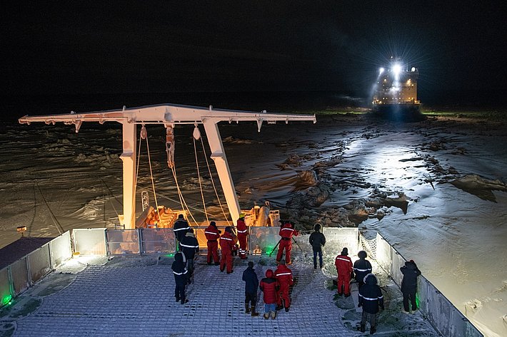 Malgré l’obscurité permanente, nous connaissons bien les chemins vers les sites nivologiques où nous prenons des mesures. Pourtant, aujourd’hui ce n’est pas le cas, car de nouvelles rigoles de glace et dorsales de compression se sont formées sur le trajet vers le « Dark Site ». C’est là, à environ deux kilomètres du navire, que nous extrayons des carottes de glace pour des études biologiques. Il a fallu à nouveau un peu modifier l’itinéraire pour nous y rendre. Il est impressionnant de voir comment des plaques de glace d’un mètre d’épaisseur et de plusieurs mètres carrés ont été poussées les unes contre les autres jusqu’à 5 mètres de haut. Ces événements ne sont pas limités : ils se déroulent généralement sur plusieurs kilomètres et peuvent être observés très nettement sur le radar du navire.