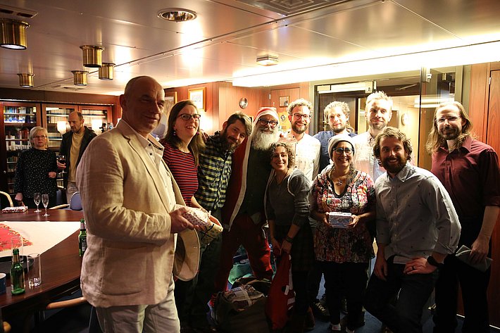 Les jours de Noël ont été particuliers, car nous avons eu le temps d’échanger avec les autres passagers du navire sur des sujets autres que professionnels. Les discours de Noël, une réception dans le « Salon Bleu », un bon dîner (même si notre alimentation est toujours très variée) et la pêche d’un cadeau dans le sac du « Père Noël » ont été des moments forts. Nous avions tous apporté un ou deux cadeaux à échanger. Matthias et moi avons enfin pu ouvrir le cadeau de Noël de nos collègues de Davos et accrocher nos cartes de vœux au mur.