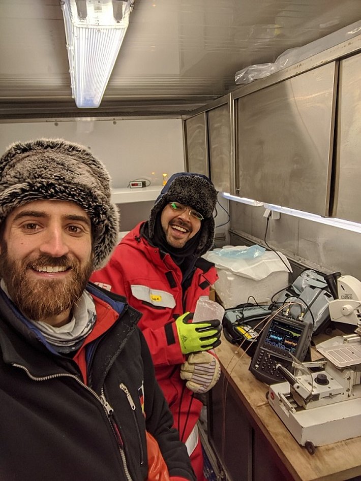 Une autre expérience consistait à mesurer les propriétés diélectriques de la glace de mer et de la couverture de neige saline à l’aide de capteurs à résonateur, ce qui n’avait pas été fait en Arctique depuis quarante ans. Nous avions déjà utilisé ces capteurs à Davos et sur l’inlandsis du Groenland et nous étions enthousiastes à l’idée de le faire dans l’une des zones les moins accessibles de la planète. Il s’agit certes d’un processus fastidieux comportant l’extraction d’une carotte de glace de mer, son découpage, et toute une série de mesures sur le terrain et dans le laboratoire réfrigéré, mais c’est aussi une excellente occasion de se rapprocher de collègues sympathiques du monde entier.