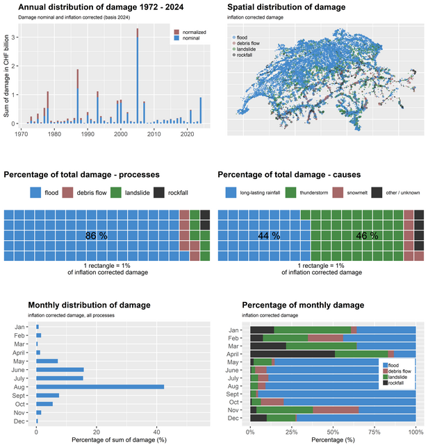 Chaque année, nous analysons les entrées de la base de données en ce qui concerne l'emplacement, l'étendue et la cause, mais aussi la répartition temporelle et spatiale des intempéries. Nous publions chaque année les résultats dans la revue Eau énergie air. Les institutions publiques peuvent obtenir les données relatives aux dommages sur demande. Celles-ci servent donc de base d'information générale pour l'évaluation des dangers.