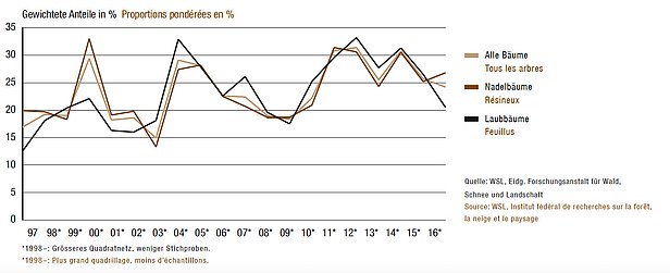 Il faut s'attendre à ce que la sécheresse de 2019 ait un impact négatif sur l'état des couronnes et que la mortalité augmente, car les effets de ces situations météorologiques extrêmes ne se manifestent souvent que les années suivantes. Ainsi, après l'été caniculaire de 2003, la défoliation des couronnes avait nettement augmenté en 2004. En revanche, l'été 2015, chaud et même sec dans certaines régions, n'a pas eu d'effets notables sur l'état des houppiers des différentes essences en 2016, sauf pour le pin (fig. 2), car la sécheresse de l'été 2015 était plutôt locale et n'a donc pas touché la Suisse dans son ensemble. En revanche, en 2018, de vastes régions de Suisse ont été touchées par la sécheresse.
