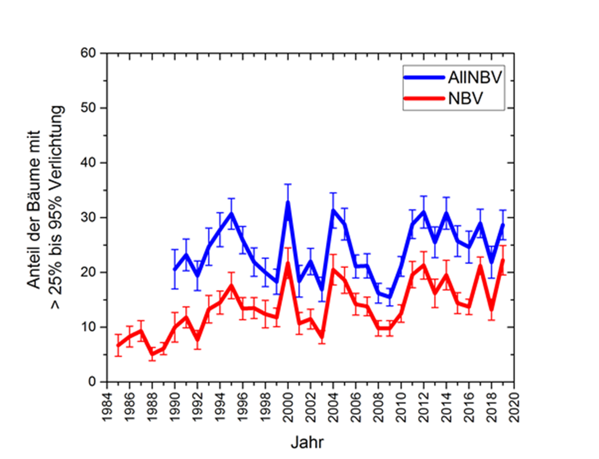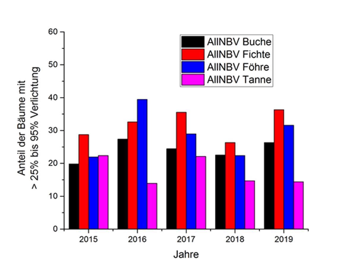 L’été chaud et sec de 2015 n’a cependant pas eu d’effets notables sur l’état actuel des couronnes. Cela peut s’expliquer par le fait que la sécheresse de 2015 était survenue relativement tard en été, après la principale phase de croissance, et avait été précédée par un printemps plutôt humide. Elle était par ailleurs plutôt localisée.