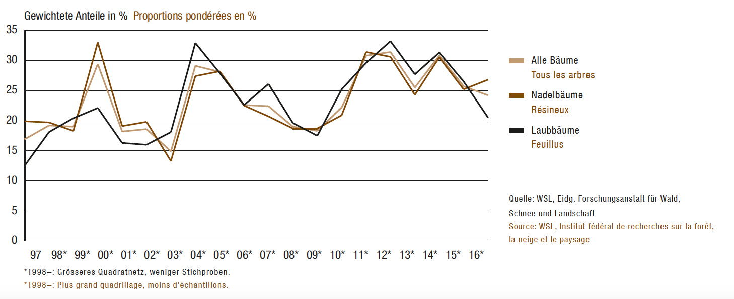 Les gelées printanières de l’année 2016 sont survenues surtout à plus de 800 m d’altitude et n’ont eu qu’une faible influence sur cette essence. En général, les conséquences d’événements climatiques extrêmes, comme les étés secs, se manifestent l’année suivante au niveau de la foliation. Ainsi, après l’été caniculaire de 2003, une nette augmentation des défoliations avait été observée en 2004.