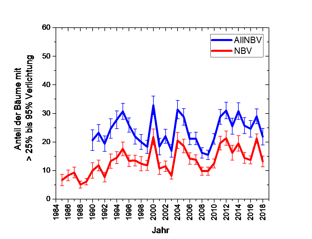 Il faut s'attendre à ce que la sécheresse de 2019 ait un impact négatif sur l'état des couronnes et que la mortalité augmente, car les effets de ces situations météorologiques extrêmes ne se manifestent souvent que les années suivantes. Ainsi, après l'été caniculaire de 2003, la défoliation des couronnes avait nettement augmenté en 2004. En revanche, l'été 2015, chaud et même sec dans certaines régions, n'a pas eu d'effets notables sur l'état des houppiers des différentes essences en 2016, sauf pour le pin (fig. 2), car la sécheresse de l'été 2015 était plutôt locale et n'a donc pas touché la Suisse dans son ensemble. En revanche, en 2018, de vastes régions de Suisse ont été touchées par la sécheresse.