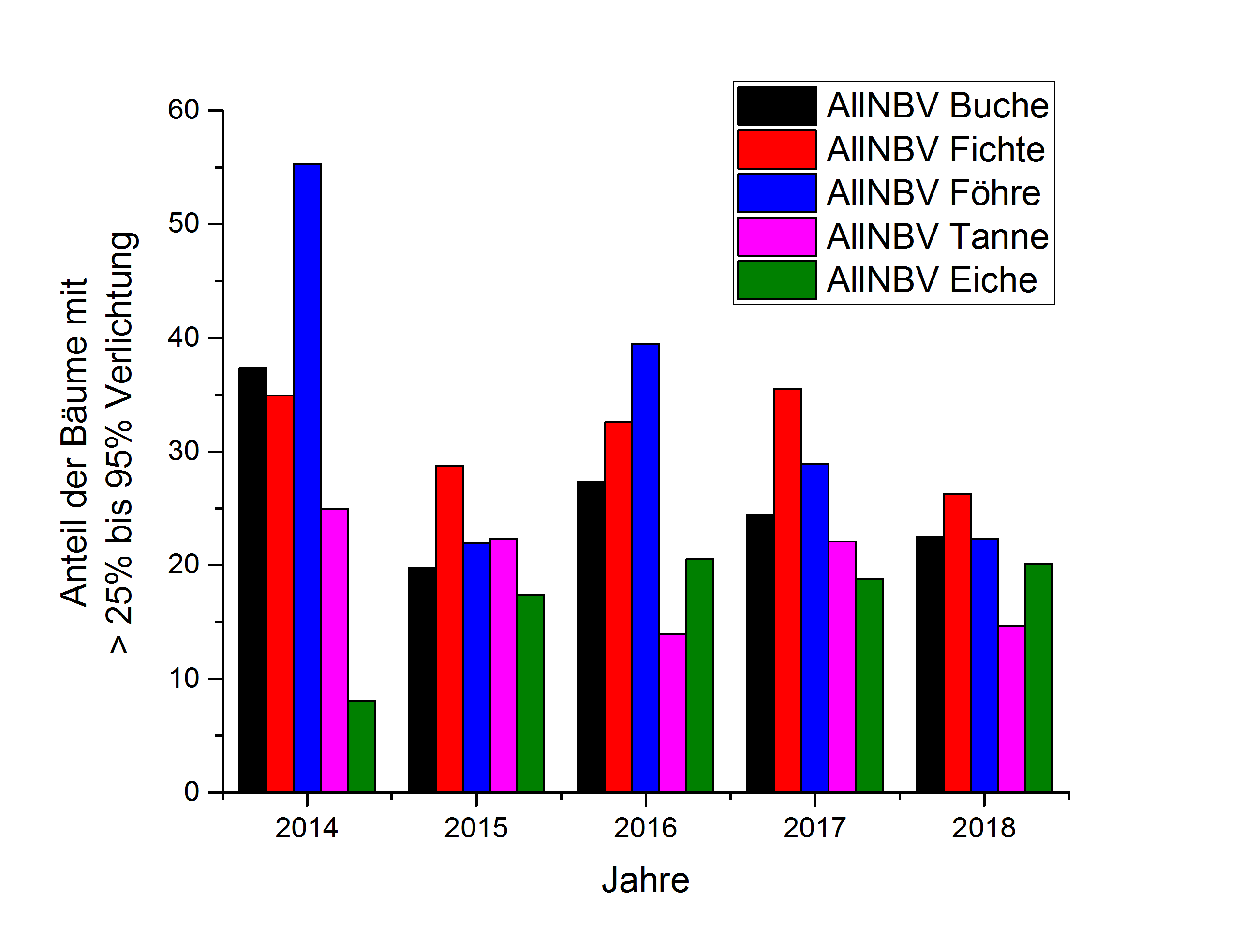 L’été chaud et sec de 2015 n’a cependant pas eu d’effets notables sur l’état actuel des couronnes. Cela peut s’expliquer par le fait que la sécheresse de 2015 était survenue relativement tard en été, après la principale phase de croissance, et avait été précédée par un printemps plutôt humide. Elle était par ailleurs plutôt localisée.