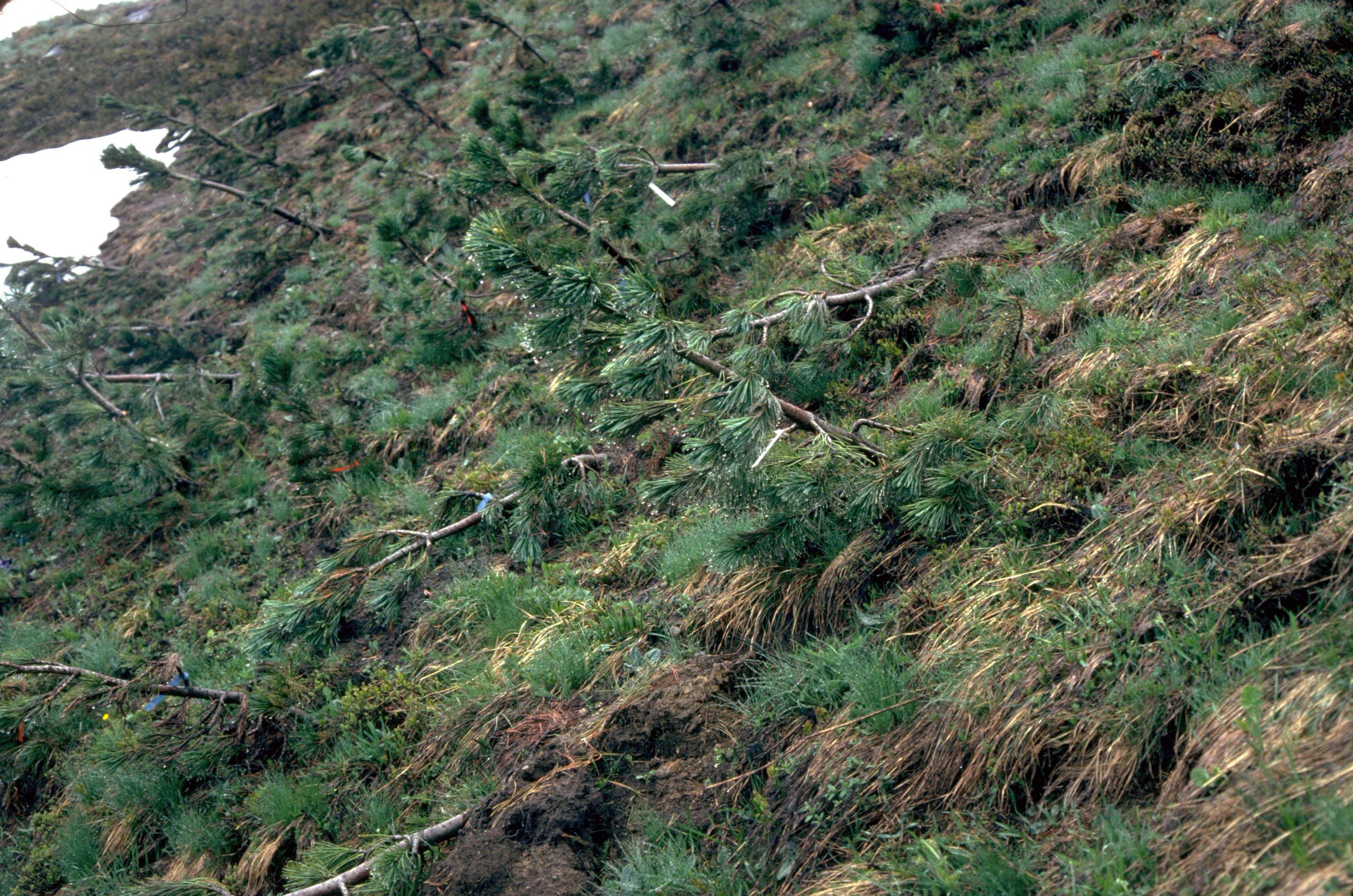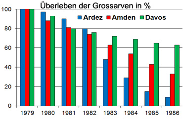 Dans les stations exposées sud, soumises au glissement et à la reptation de la neige, tous les grands arolles ont péri. Le manque d'enracinement dans le sol en a été la cause. Soumis aux énormes contraintes de la couche neigeuse durant l'hiver, les arolles avaient été, ou écrasés, ou entièrement arrachés avec leurs grosses mottes de racines. Dans les zones à tendance sécharde, le déséquilibre entre la masse foliaire et le volume racinaire a grandement contribué à un choc de transplantation. De nombreux arbres n'ont jamais pu s'en remettre, d'autant moins que divers insectes et maladies cryptogamiques ont profité de leur affaiblissement. Les recherches engagées à la limite supérieure de la forêt ont besoin de dizaines d'années avant de pouvoir fournir des résultats fiables. La mise en valeur des données recueillies entre 1979 et 1986 (diagramme ci-dessus) permet de documenter la reprise des grands arolles durant leur première phase de croissance après la plantation. Mais 28 ans après celle-ci, il ne restait plus que quelques exemplaires au Stillberg près de Davos et à Mattstock au-dessus d'Amden et aucun n'avait survécu à Ardez (Muot dal Hom).
