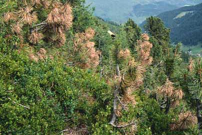 En Basse-Engadine, sous un climat continental, les grands arolles ont été plantés sur une pente exposée sud-est, à la limite forestière altitudinale. Les arbres ont été traités chimiquement contre la frayure du gibier. Le choc de transplantation s'est avéré être la cause principale de mortalité sur cette station à tendance sécharde. De nombreux arbres sont en effet morts de dessèchement, les plus fortes pertes survenant quatre ans après la plantation. Des attaques d'insectes et des maladies cryptogamiques ont également contribué au haut taux de mortalité. Au niveau des champignons, il s'agissait de deux espèces typiques en montagne, le dépérissement des pousses (Gremmeniella sp.) et la chute des neiges de l'arolle (Phacidium infestans Karst). Quant aux insectes, divers charançons et scolytes ont été retrouvés sous et sur l'écorce des arolles dépérissants. En plus, d'importantes colonies de pucerons (Cinara cembrae) s'étaient développées sur les branches et le tronc des arbres. Souvent, les parties des arbres encore vitales étaient abrouties et les aiguilles mangées par le tétras-lyre ou le lagopède alpin. Par contre, très peu de frayure a été constatée. Il ne restait plus que 9% des arbres sept ans après la plantation.