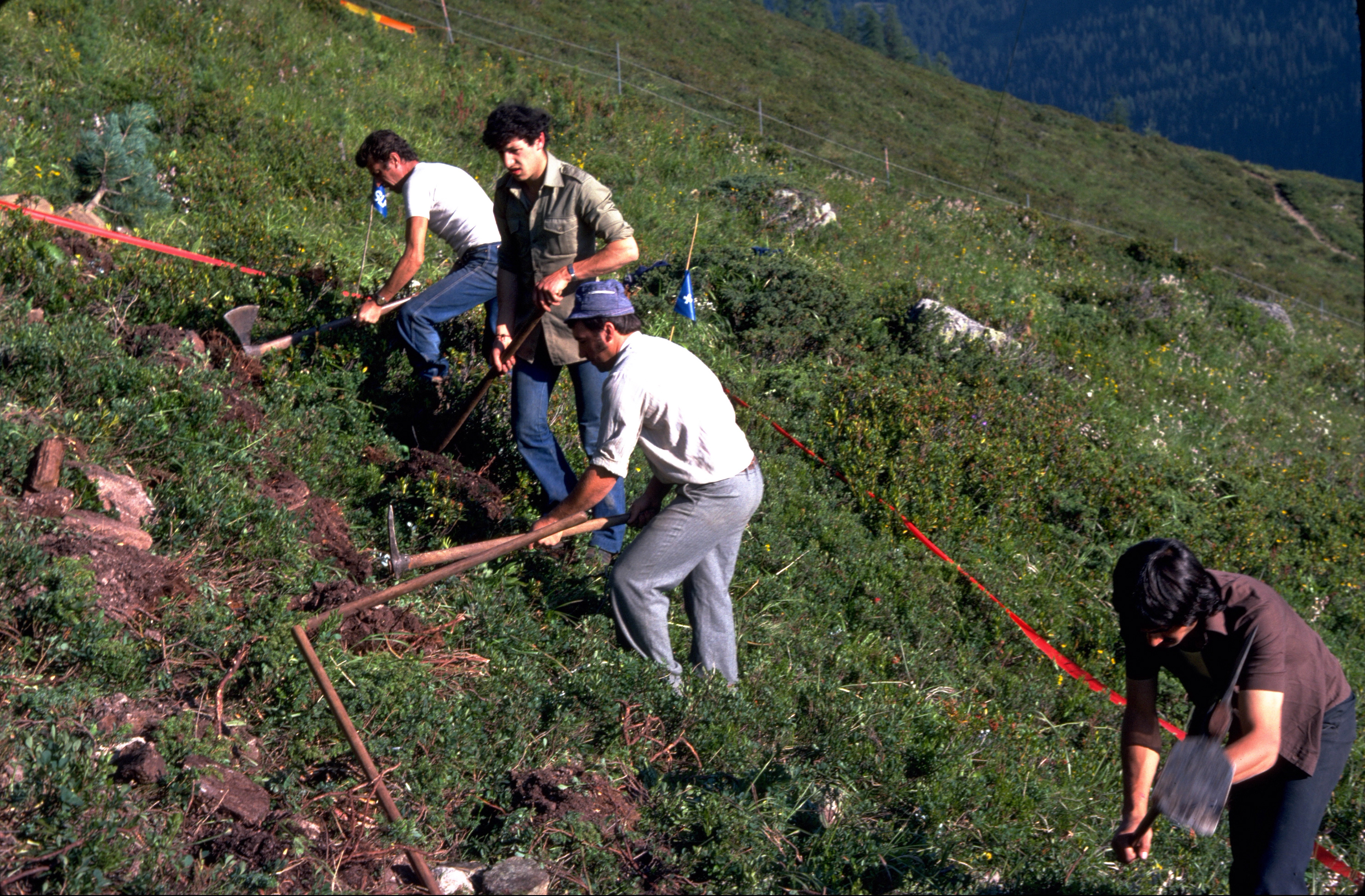En 1978, le WSL a voulu tester l'aptitude de grands plants en mottes pour des afforestations en montagne. L'essai a fourni des résultats concernant la plantation de grands arolles dans des conditions de concurrence de la végétation (mégaphorbiaie), et également de glissement et de reptation de la neige en situation de fortes pentes exposées au sud. L'essai a été réalisé sur trois sites, soit un total de 1800 arolles, à raison de trois groupes de 200 arolles par site. Les arbres, âgés de 12 à 14 ans, étaient issus de la pépinière de S-chanf en Engadine, située à 1662 m d'altitude. Les arolles présentaient au moment de la plantation une hauteur moyenne de 78 cm. Les mottes, d'un diamètre d'env. 35 cm, contenaient un volume de 14 litres de terre de la pépinière.