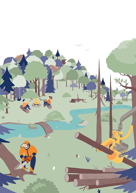 Le bois est la matière première la plus importante de la forêt pour les humains. Mais celle-ci fournit aussi d’autres produits et prestations dont l’utilisation doit être soigneusement planifiée pour être durable face aux changements climatiques. Depuis 2015, quelque 5 millions de m3 de bois sont récoltés et vendus annuellement, dont environ 66 % de résineux et 34 % de feuillus. En raison d’une mortalité accrue avant tout de l’épicéa et du hêtre, l’accroissement net, soit la croissance des arbres vifs, est pour la première fois en recul dans certaines régions. La part des exploitations forcées a fortement augmenté, surtout à basse altitude. La fréquence accrue des périodes de sécheresse dues aux changements climatiques devrait encore faire augmenter la part de résineux dans la récolte du bois. Outre la production de bois, la forêt fournit de nombreuses autres prestations, notamment en matière d’approvisionnement et de régulation et dans le domaine culturel. Leur mise à disposition occasionne des coûts qui n’ont été que partiellement couverts jusqu’ici. Parmi les prestations forestières, des produits non ligneux comme les champignons, le gibier, le miel et les sapins de Noël ont vu leur importance s’accroître et sont de mieux en mieux valorisables. Les changements climatiques et les exigences croissantes de la société envers la forêt rendent la planification forestière plus complexe. Celle-ci requiert des relevés fiables et des instruments de planification qui permettent de tenir compte de tous les aspects de l’exploitation de la forêt.