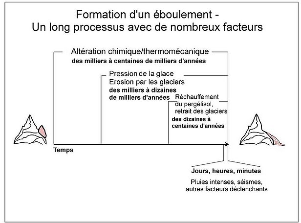 La déstabilisation des parois rocheuses ne survient pas du jour au lendemain. Elle est plutôt le résultat d’un long processus, pouvant durer pendant de nombreux millénaires. Selon la structure du rocher (fissures, stratification, solidité) et la topographie, les processus d’érosion agissent plus ou moins vite. En haute montagne, les glaciers et le pergélisol jouent en outre un rôle important. Différents facteurs peuvent contribuer à la formation et l’ouverture des fissures, et ainsi déstabiliser de plus en plus le rocher :