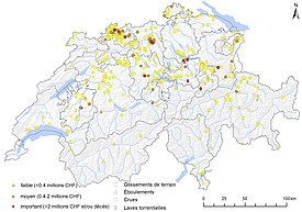 L’Institut fédéral de recherches WSL collecte systématiquement depuis 1972 les informations sur les dommages liés aux intempéries. La banque de données créée avec l’assistance de l’Office fédéral de l’environnement OFEV contient des informations sur les dommages provoqués par les crues, les coulées de boue, les glissements de terrain ainsi que, depuis 2002, les éboulements et chutes de pierres. Les dommages provoqués par les avalanches, la pression de la neige, les séismes, la foudre, la grèle et les tempêtes de vent ne sont pas pris en compte. L’évaluation des dommages aux biens, aux infrastructures, aux forêts et à l’agriculture se base principalement sur ce que rapportent les médias. Les données sont à disposition des spécialistes, sur demande, et constituent une base essentielle pour l’évaluation des dangers.