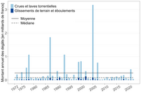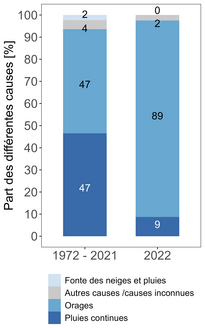 Sur une série d'observations de 51 ans, l'année 2022 se classe parmi les dix années les moins dommageables. Avec 45 millions de francs, les coûts des sinistres sont environ dix fois inférieurs à ceux de 2021. La majeure partie des coûts estimés des dommages (environ 91 %) est due aux inondations, suivies des chutes de pierres et des éboulements (4 %), des glissements de terrain (3 %) et des laves torrentielles (2 %). Les causes étaient principalement des orages et de fortes précipitations, mais un dixième des dommages ont été dus à des pluies continues.