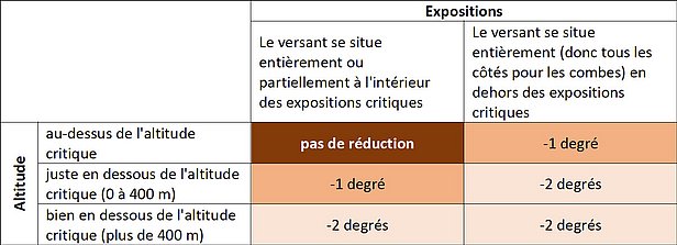 Comme décrit dans l'aide à l'interprétation, le degré de danger prévu s'applique aux versants mentionnés dans le bulletin d'avalanches, tant en ce qui concerne l'altitude que l'exposition. L'étude a maintenant confirmé la validité de la règle «1 degré». Sur les autres versants, le danger d'avalanche est d'un degré inférieur, parfois encore moindre. Dans certains cas, on peut supposer que ce danger est même inférieur de deux degrés (fig. 2) et que le risque statistique moyen diminue donc en conséquence.