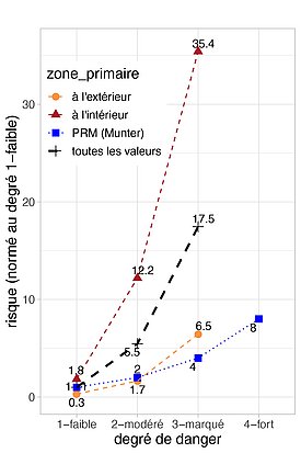 - Le risque d'avalanche augmente fortement d'un degré de danger à l'autre, et ce d'un facteur 4 environ (courbe noire dans la figure 1). Le doublement du potentiel de danger souvent supposé1 sous-estime donc l'augmentation constatée dans l'étude.