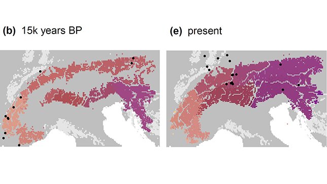 Dans une dernière étape, Flurin Leugger a simulé la répartition des populations de chamois au cours des 20 000 années suivantes, en fonction de l'évolution des conditions climatiques. Ces simulations ont montré comment les chamois ont de plus en plus peuplé l'espace alpin avec le réchauffement du climat et le recul des glaciers. Le chercheur a fait varier certains paramètres des simulations, par exemple la vitesse moyenne de migration des chamois, et a intégré des obstacles géographiques artificiels. Il a ensuite comparé le résultat de chaque simulation à la distribution génétique actuelle des animaux, ce qui lui a permis de comprendre de mieux en mieux quels facteurs influencent la répartition des populations de chamois.