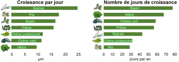 Les résultats montrent que seule une petite partie de la période de végétation (12 % à 30 %) est effectivement utilisée pour la croissance annuelle. En effet, sur une année, la période de végétation compte environ 250 jours, dont 90 à 120 pendant lesquels la croissance est effectivement possible. Or, les données ont révélé que les arbres n'utilisent pas entièrement cette petite fenêtre. «Nous avons été surpris de constater que nos sept espèces d'arbres ne poussent en moyenne que 29 à 77 jours par an», commente Sophia Etzold, biologiste au WSL à Birmensdorf et première auteure de l'article. C'est le sapin qui a poussé pendant le plus de jours par an, et le pin pendant le moins. L'épicéa, en revanche, a enregistré les taux de croissance journaliers les plus élevés (25 µm/jour), mais pendant seulement 43 jours par an en moyenne.