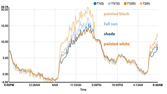 Selon mon point de vue les bourgeons sont de véritables thermomètres et peuvent détecter des infimes variations de la température. J'ai donc installé un total de 33 minuscules capteurs de température à l’intérieur même des bourgeons. Ces capteurs ressemblent à des aiguilles pour faire une prise de sang. Ils enregistrent la température toutes les 10 minutes et transmettent les données directement à un serveur. Les résultats sont stupéfiants ! Par exemple, on peut voir que la température "ressentie" par un bourgeon noir les jours de soleil est jusqu'à 6 degrés plus élevée que celle d'un bourgeon blanc. Plus intéressant encore, cette différence est d'environ 3 degrés entre les bourgeons à l'ombre et ceux en plein soleil [voir graphique].