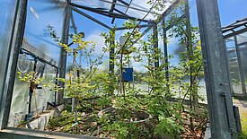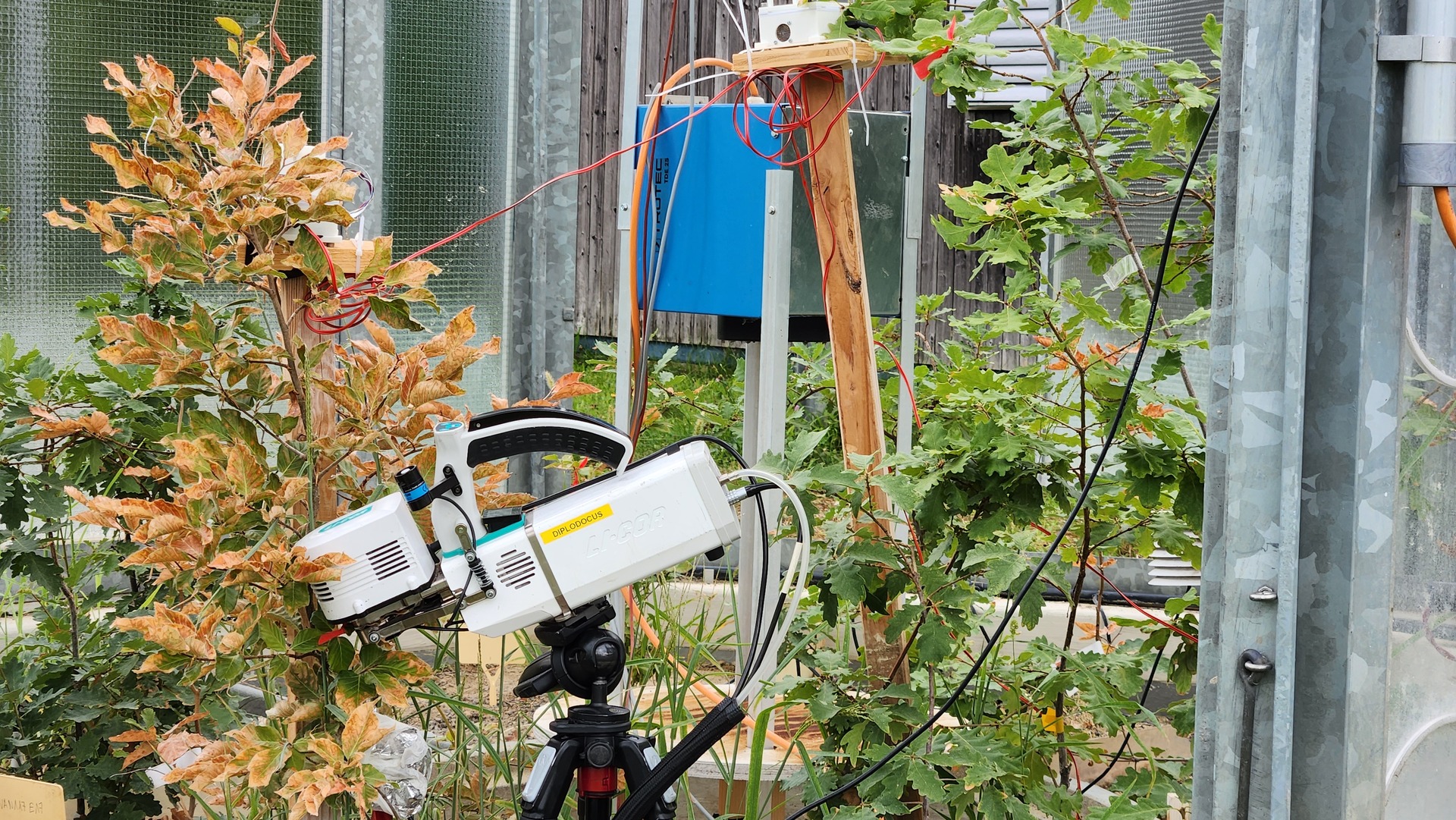 Sur le site du WSL à Birmensdorf (ZH), de jeunes hêtres et chênes pubescents poussent depuis plus de 5 ans dans des chambres climatiques. Dans ces serres miniatures (Modoek), les chercheurs ont soumis les arbres à différents niveaux d’humidité du sol et de température de l’air. Alors que certains arbres ont subi une sécheresse en continu, d’autres ont poussé à une température élevée de 5 °C, afin de simuler les conditions futures, ou ont dû endurer à la fois la chaleur et la sécheresse.