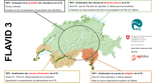 - WP1 : Mise en œuvre d'approches de gestion de l'habitat à intégrer avec les stratégies de contrôle actuelles dans les zones où la FD et S. titanus sont établis (FDp endémique, S. titanus répandu ; zone d'étude : Suisse méridionale) ;