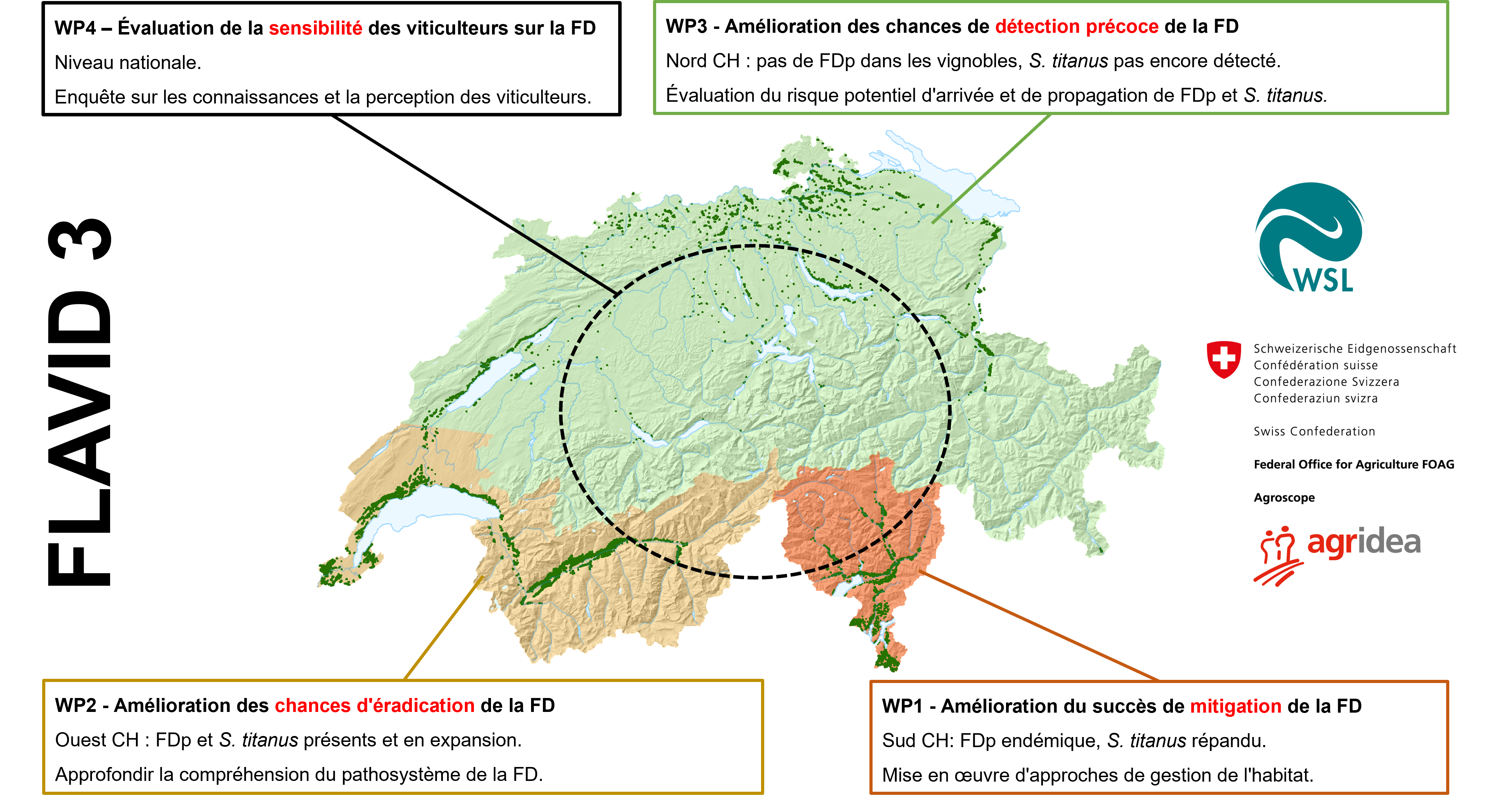 - WP3 : Évaluation du risque potentiel d'arrivée et de propagation de la FD et de S. titanus dans des zones actuellement exemptes de FDp et de ses vecteurs (c'est-à-dire pas de FDp dans les vignobles, S. titanus absent ; zone d'étude : Suisse nordorientale) ;