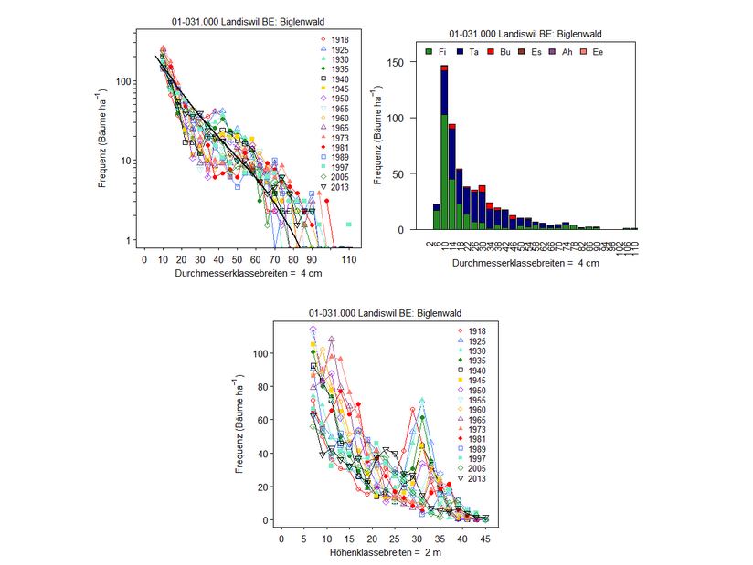 Abbildung 1. Ein Beispiel der Durchmesserverteilungen für eine Picea abies – Abies alba Plenterwaldversuchsfläche (1-031.000). Die durchgezogene schwarze Linie im oberen Feld zeigt den „Gleichgewichtszustand“ des Bestands und zeigt eine In-Transformation der Frequenz auf der y-Achse. Das mittlere Diagramm zeigt die Baumartenzusammensetzung der letzten Inventur an, ohne In-Transformation der y-Achse. Das untere Diagramm zeigt, die Höhenverteilung. Das untere Diagramm zeigt die Höhenverteilung.