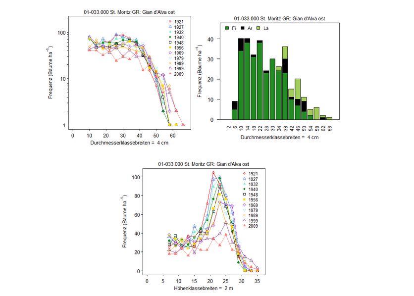 Abbildung 2. Im Gegensatz zu den obigen Abbildungen zeigt diese Abbildung einen Bergwald mit Picea abies, Pinus cembra und Larix decidua, der sich in einem Überführungsstadium in Richtung Plenterwald befindet (01-033.000). Es ist zu beachten, dass noch zu viele Bäume in den mittleren und oberen Durchmesser- und Höhenklasssen vorhanden sind. Dieser Überfluss an starken Bäumen wurde jedoch mit jedem Eingriff reduziert, wie im unteren Diagramm zu sehen ist.