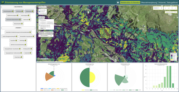 - Ermittlung von Anfälligkeiten und Risiken: Wie können wir raumbezogene Daten und Modelle zu Waldstruktur, Standortbedingungen und potenziellen Naturgefahren integrieren, um interaktive Karten zu erstellen, die multiple Risiken unter extremen Störungen aufzeigen?