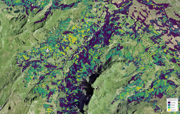 - Anfälligkeitskarten: Eine Reihe flächendeckender Karten, die jene Waldgebiete hervorheben, die besonders anfällig für Borkenkäferbefall, Windwurf und Schneebruch sind. Die Karten berücksichtigen zahlreiche Parameter zur Waldstruktur und standörtliche Faktoren, einschließlich der Schutzfunktion der Wälder vor Steinschlag und Lawinen. Ziel ist es, ein ganzheitliches Vorgehen bei der Priorisierung von Waldmanagementmaßnahmen zu fördern und gezielte Eingriffe zu ermöglichen.