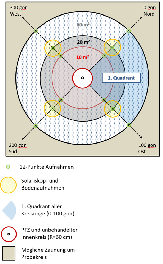 De plus, à quatre des 12 points d’échantillonnage, l’épaisseur de la litière organique, la forme d’humus ainsi que les conditions lumineuses sont mesurées à l’aide d’un Solariskop (Ing.-Büro Behling, Hermannsburg, Allemagne).