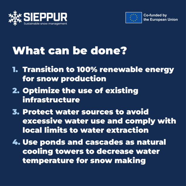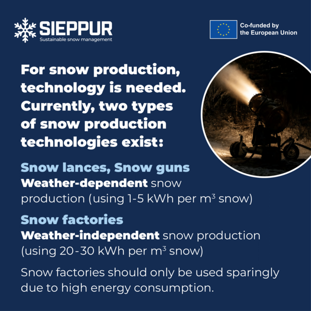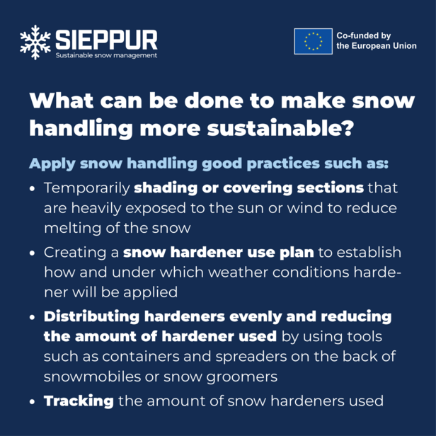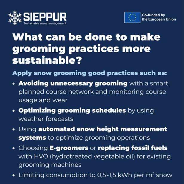 The main objective of SIEPPUR is to develop and implement concrete measures to enhance the sustainability of snow management in Nordic snow sports. Based on an initial assessment of current practices in selected snow sports venues, SIEPPUR will identify best practices for minimising resource use and improving sustainability governance in snow sport organisations. Based on modeled snow climatological scenarios for venues across the continent, the project will develop new knowledge to advance the different dimensions of sustainable snow management practices from production, storage, transport, grooming to handling. The project will translate the new knowledge into implementation roadmaps for different geographical circumstances. SIEPPUR will provide practitioners with helpful management tools and techniques to monitor and minimise water and energy use and to optimise the efficiency of snow management.