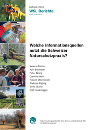 Fabian Y., Bollmann K., Brang P., Heiri C., Olschewski R., Rigling A., … Holderegger R. (2018) Welche Informationsquellen nutzt die Schweizer Naturschutzpraxis? WSL Berichte 62. Birmensdorf: Eidg. Forschungsanstalt für Wald, Schnee und Landschaft WSL. 64 S.