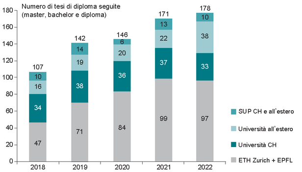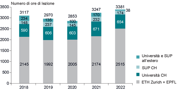 Le lezioni e i corsi del WSL completano le offerte delle scuole universitarie con temi nei quali il WSL vanta una competenza particolarmente elevata. Nel 2022, circa 140 collaboratrici e collaboratori del WSL hanno tenuto 3381 ore di lezione presso i due politecnici federali, le università cantonali, le scuole universitarie professionali così come presso diversi atenei all’estero . La maggior parte di esse – circa il 75% – si è svolto presso i politecnici federali.