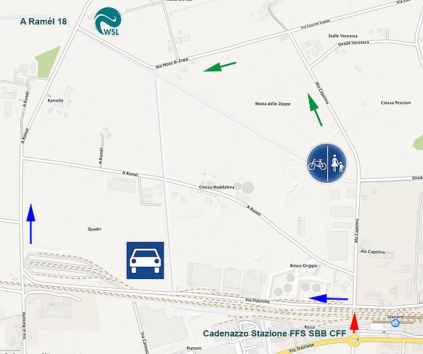 - da Nord => Uscire dall'autostrada a Bellinzona Sud e seguire per Cadenazzo (direzione Locarno). Una volta raggiunta la stazione FFS di Cadenazzo svoltare a destra alla prima rotonda e prendere il sottopassaggio. Immediatamente dopo girare a sinistra e entrare in Via Industrie, poi a destra seguendo il cartello "Campus di ricerca".