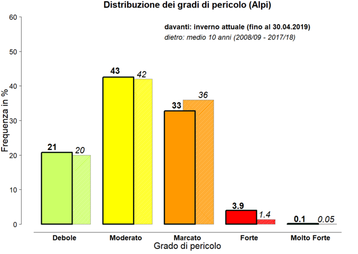 Fino alla fine di aprile, l’SLF ha ricevuto segnalazioni relative a 299 valanghe con danni personali o materiali, che hanno causato la morte di 19 persone. Negli ultimi vent’anni le valanghe hanno causato mediamente 21 vittime durante il semestre invernale. Ad eccezione di due persone, tutte le vittime di valanghe erano sportivi invernali che si trovavano in terreni non protetti. Due delle vittime sono state le pattuglie delle piste: una è morta in servizio su una pista da sci aperta, l'altra mentre lavorava per assicurare la pista. Degno di nota è il ripetersi di sei incidenti mortali sul versante nordalpino occidentale. Questi incidenti sono da ricondursi a una struttura del manto nevoso che è rimasta sfavorevole a lungo, circostanza piuttosto eccezionale per questa regione.
