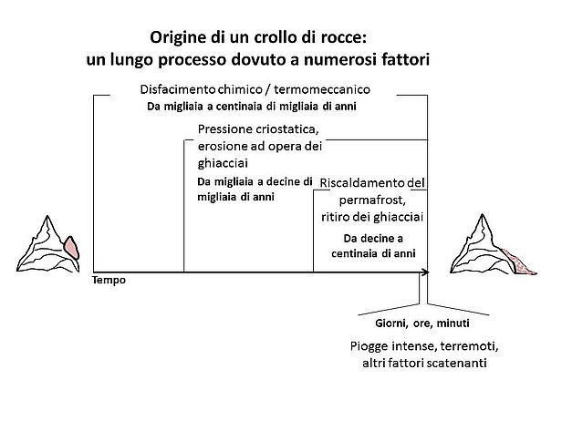 Questi fattori agiscono lungo intervalli temporali molto diversi fra loro. Le variazioni della temperatura nell’alternanza delle stagioni possono indebolire la roccia nel corso di millenni. Le piogge intense, per contro, diventano decisive una volta che si sono già aperte delle fessurazioni in cui l’acqua può ristagnare ed esercitare quindi pressione sulle rocce. La pressione del ghiaccio all’interno delle fessurazioni è un fattore rilevante in alta montagna. Tale pressione si viene a creare quando l’acqua meteorica oppure l’acqua contenuta nello spazio poroso della roccia penetra nelle fessurazioni dove poi si ghiaccia. Ciò comporta la formazione e l’espansione di cunei di ghiaccio che provocano la rottura della roccia.